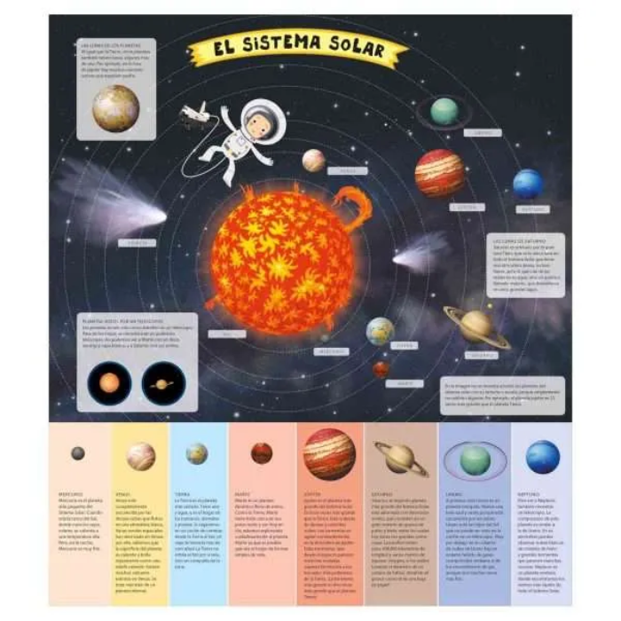 El Atlas del Espacio es un atlas actualizado, maravillosamente ilustrado, con 6 grandes páginas plegables, que presenta a los jóvenes lectores las maravillas del espacio exterior y les revela una historia fascinantes de la creación del universo. Está lleno de hermosas imágenes, a todo color del sistema solar, gráficos fáciles de seguir de las principales constelaciones, además de una gran cantidad de datos ilustrados.
