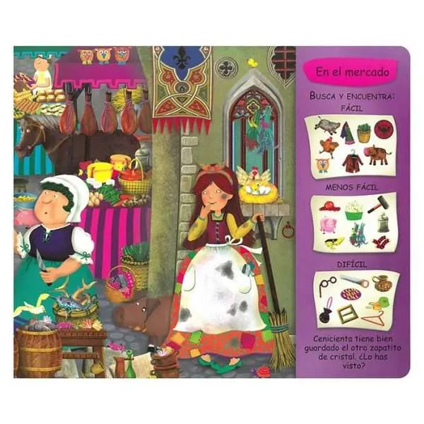 En el libro Cenicienta te divertirás con la historia en una versión muy original. Además, en cada página del libro hay un montón de objetos y personajes que el príncipe, en su búsqueda de la dueña del zapatito, no ha podido encontrar. Hay algunos muy fáciles, otros no tan fáciles y otros un poquito difíciles. ¿Sabes tú dónde pueden estar?